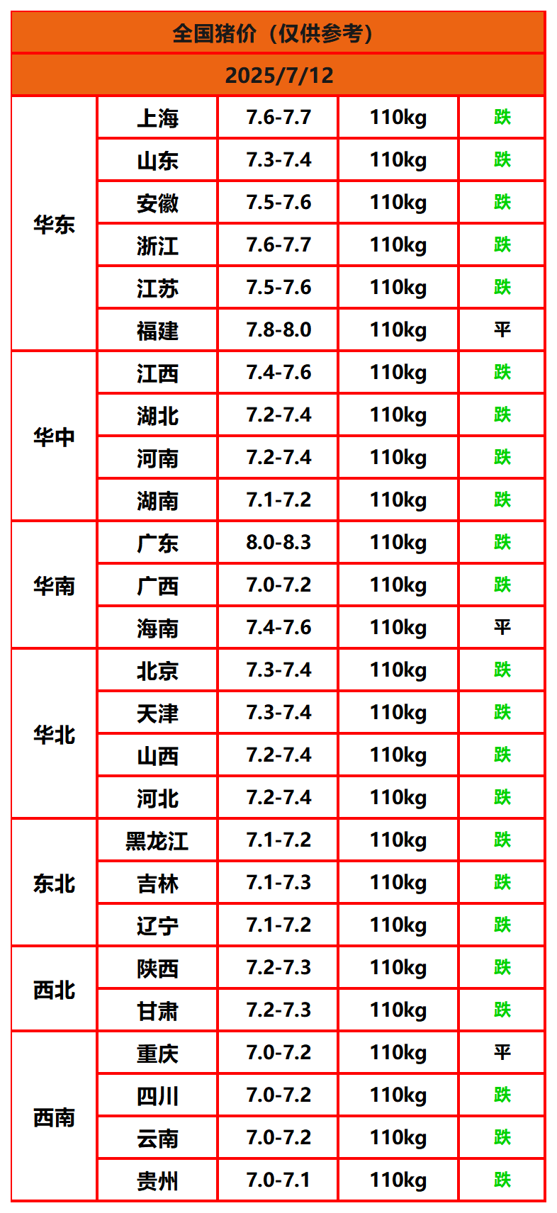 今日猪价 | 2025年7月12日全国猪价行情一览表!