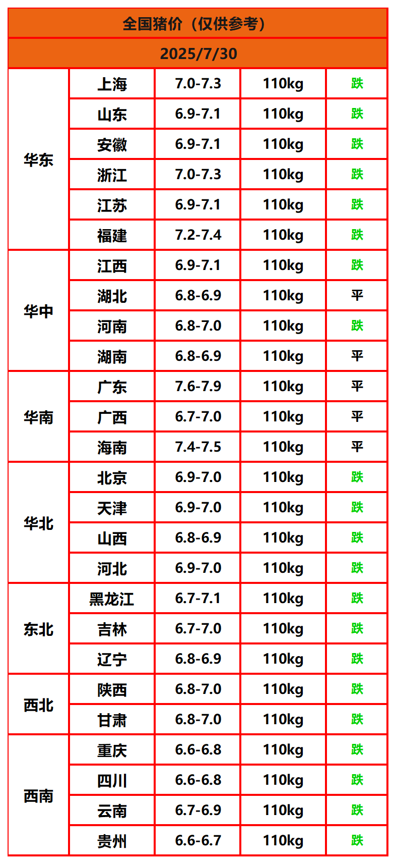 2025年7月30日猪价,今日全国猪价行情走势:0涨5平21跌。
