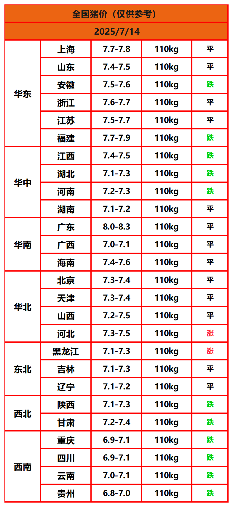 2025年7月14日猪价,今日全国猪价行情走势:2涨11平13跌。