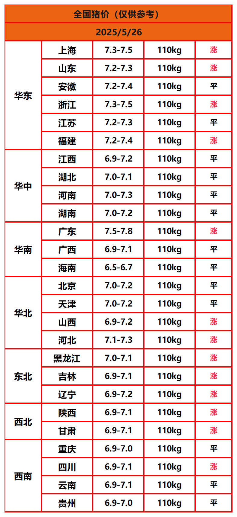 2025年5月26日猪价,今日全国猪价行情走势:13涨13平0跌。