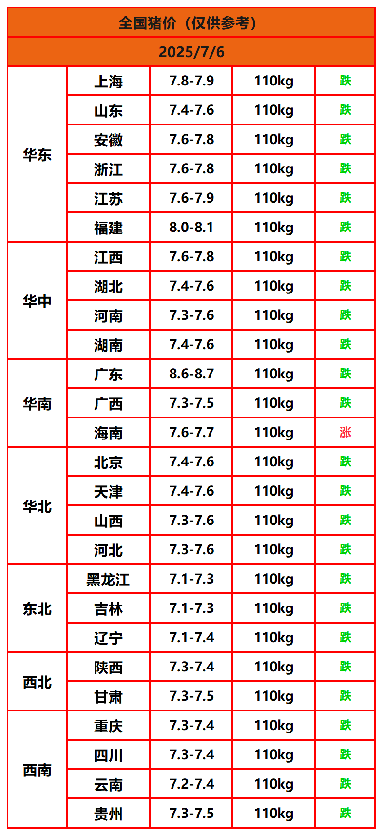 2025年7月6日猪价,今日全国猪价行情走势:1涨0平25跌。